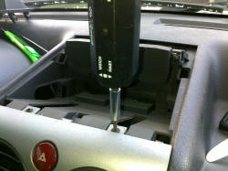 Připravíme se na akci "ježek v kleci II" . Za použití mírné síly by se nám mělo podařit celý panel dostat ven. Výměna žárovek by se sice dala provést již i takhle, ale radost by z toho asi měli jen gynekologové, každý jiný to po pár minutách stejně raději vyndá... Panel vysuneme, jak je naznačeno. V palubce jsou dole dvě šikmá vybrání, jimi se dají šikovně prostrčit různé výstupky, co z panelu čouhají. Je třeba mírně nadzvedávat příčku nad panelem, projde to jentaktak..