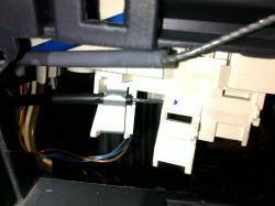 Následně budeme vracet na místa všechny bowdeny v obráceném pořadí, začínáme černým. Nasadíme konec lanka do příslušného táhla - jsou barevně odlišena. Konce bowdenů musí být až u přepážky v plastu, kde je vybrání pro lanko - pomůžeme si přitažením do správné polohy pomocí příslušného ovládacího kolečka a zacvakneme plechovou pojistku.